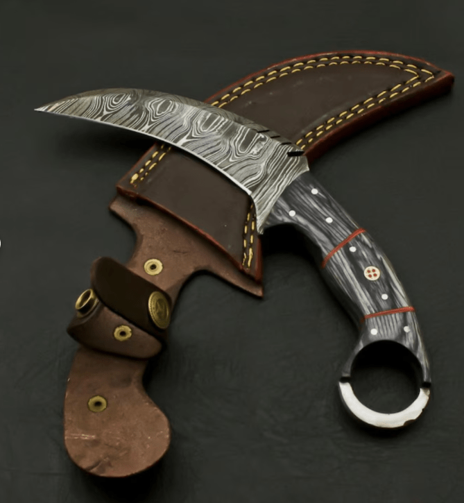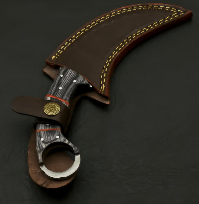 This beautiful hunting knife was designed and made by Ameer Enterprises. Knife is not only stunning in looks but it is also rock solid because of robust construction with its 4 mm thick blade. Beautiful Damascus blade of the knife is the result of hours and hours of forging. Not many makers can keep such pattern of layers upon layers flowing all the way to the edge of the blade, which creates a saw-blade effect at microscopic level, allowing the blade to keep cutting while other blades have dulled. the blade of this knife with 1095 and 15N20 high carbon steel true layers (512). Blade was given excellent heat treatment and Rockwell hardness of the blade along its edge is 54 and along the spine is 42-45. 4 mm thick blade has fantastic hand grinds on both side with top side left with a false edge. Overall length of this knife is whopping 9.25″ and the length of the blade is 5.0″. Superb handle is a work of art. It is made of resin & pakka wood & rose wood scales fastened with steel pins and strong epoxy for life time durability.