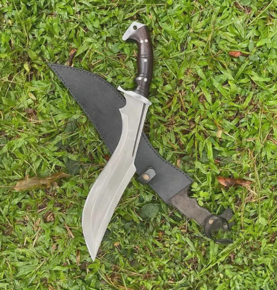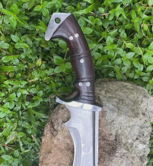 21-inch Aesthetic Handmade Historical Kukri Knife has a 14.5-inch blade made up of the highly graded carbon steel. This fully functional and sharpened knife has a full tang handle of length 6.6 inch and is made of high-quality Rosewood. This razor-sharp knife is hand forged in the country of the Himalayas. The handle of the blade is made of Rosewood. This knife can be used as both hunting and household tools. The total weight of the knife is 1225 grams and the weight of the blade excluding the sheath is 1020 grams.