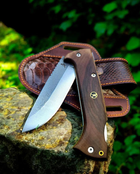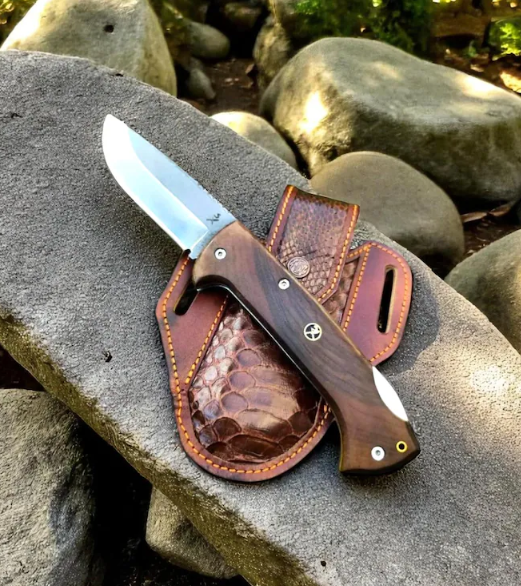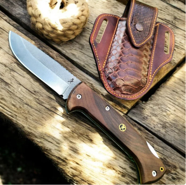 The handle is crafted from natural walnut wood, providing a warm, ergonomic grip. What truly sets this knife apart is its genuine python and cowhide leather sheath ā an exotic and rugged addition that protects your knife in style.