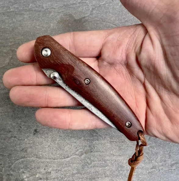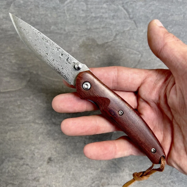 Small folding knife Damascus steel blade customizable engraving pocket forged wood handle linerlock edc camping custom gift for menAvailability: 19 in stock